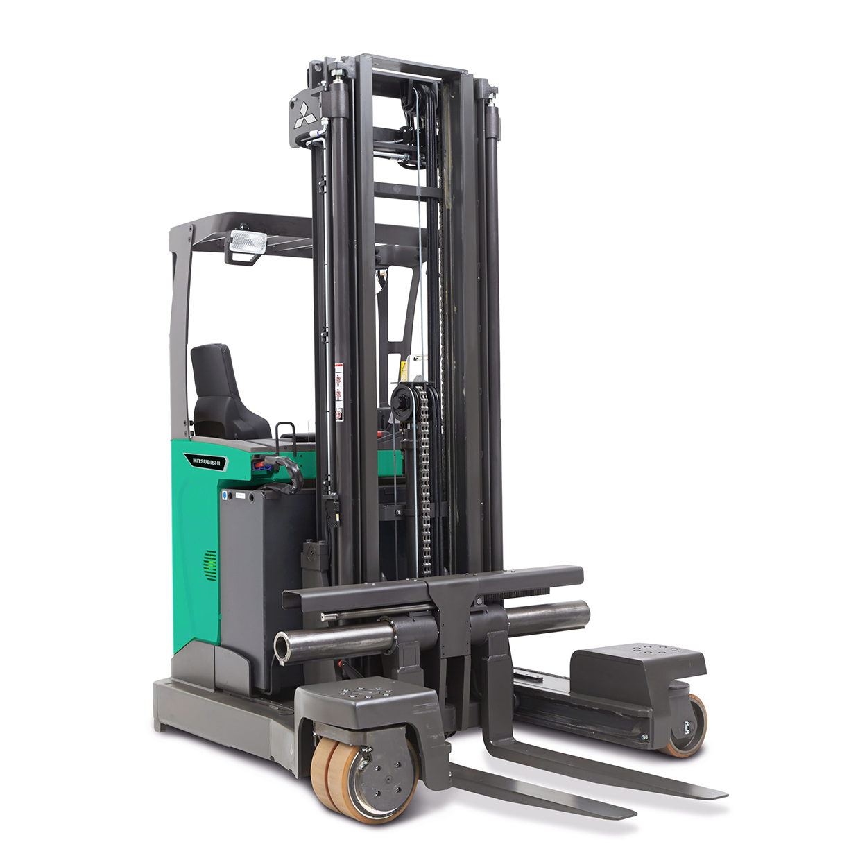 Der RBM Mehrwege und 4-Wege Schubmaststapler von Mitsubishi sind ideal geeignet für Lange Lasten Seitlich zu transportieren. Der RBM fährt Vorwärts, Rückwärts, seitlich und kann mit seinen 360 ° lenkung jede Lange Last präzise transportieren.