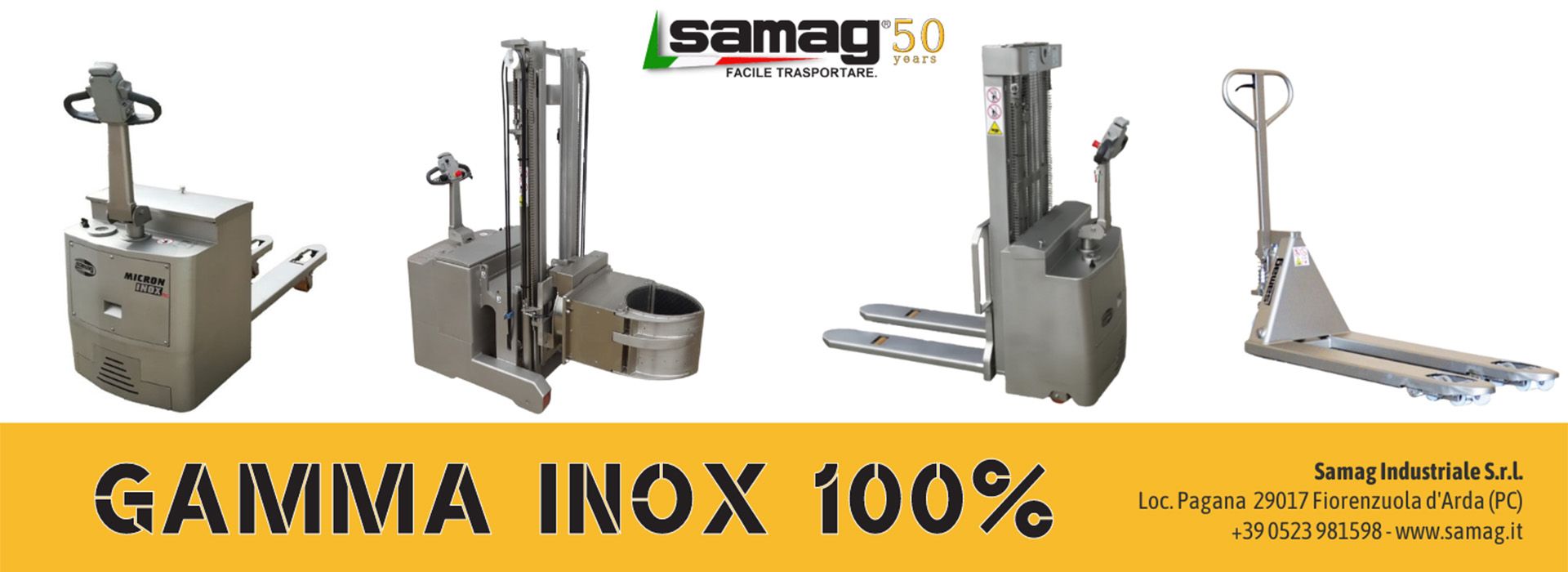 SAMAG Industriale S.r.l. präsentiert eine hochwertige Palette an Hubwagen aus Edelstahl bzw. korrosionsgeschütztem Material, insbesondere ausgelegt für anspruchsvolle Bereiche mit hohen Hygieneanforderungen – wie Lebensmittelindustrie, Chemie-, Pharma-, Fisch-, Fleisch- und Milchindustrie